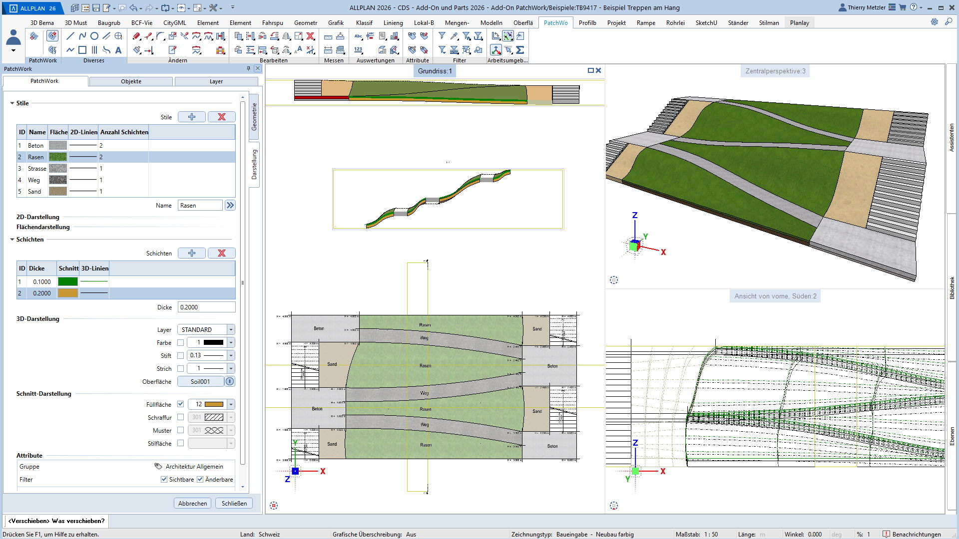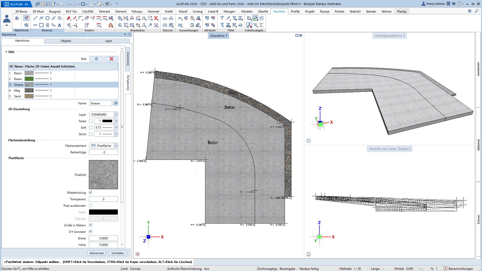 Der innovative Workflow ermöglicht die Geometrieerzeugung durch Punkte, Linien, Kreise, Splines und Kurven. In einem zweiten Schritt platzieren Sie Höhenpunkte an Eck- und Schnittpunkten, definieren Bereiche und weisen diesen verschiedene Materialstile zu – zum Beispiel Asphalt, Beton, Platten, Sand oder Rasen. PatchWork generiert daraus perfekte 2D-Darstellungen und 3D-Volumen, die aus mehreren Materialschichten bestehen können.