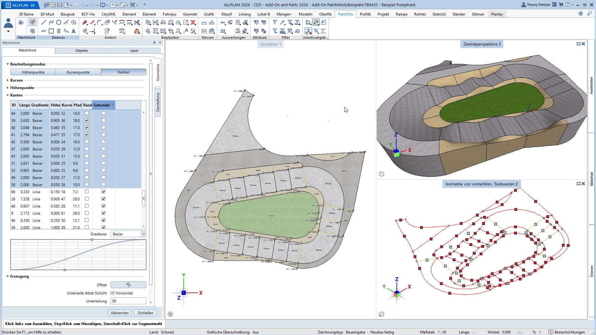 Alle Punkte, Linien und Kurven sind jederzeit anpassbar – Längenprofile, Flächen und Volumina lassen sich in jeder Planungsphase flexibel verändern. Und das alles über eine übersichtliche Palette, ohne Spezialwissen oder Programmierkenntnisse.