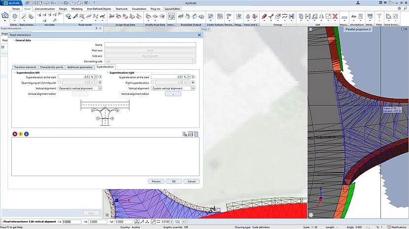 Die neueste Version erweitert die parametrische Modellierung von Straßenkreuzungen, um mehr Flexibilität und Präzision bei der 3D-Detaillierung anzubieten. Anwender:innen können nun die vertikale Geometrie von Kreuzungskanten mithilfe von Tangentenpolygon-Eingaben definieren. Das ermöglicht glatte, komplexe Übergänge und eine unabhängige vertikale Anpassung der linken und rechten Kantenprofile. Diese Verbesserungen führen zu genaueren und realistischeren Kreuzungsmodellen, reduzieren den manuellen Nachbearbeitungsaufwand und unterstützen einen kontinuierlichen parametrischen Arbeitsablauf, der 3D-Entwürfe und 2D-Dokumentationen für komplexe Infrastrukturprojekte vereint.