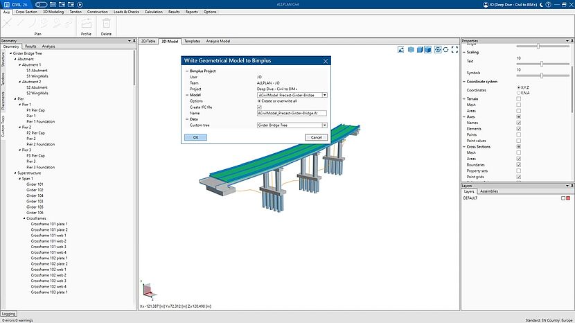 Die Fertigteilbrückenlösung von ALLPLAN bietet einen hochautomatisierten, BIM-basierten Workflow. Dieser kombiniert parametrische Modellierung, statische Berechnungen und normkonforme Detailplanung (EN, AASHTO LRFD 9), um den Prozess vom Entwurf bis zur Fertigstellung um bis zu 70 % zu optimieren. Mithilfe parametrischer Trägerelemente, modularer 3D-Vorlagen und nahtloser BIM-basierter Zusammenarbeit können Ingenieure Achsen und Querschnitte schnell definieren und Komponenten mit flexiblen, parametergesteuerten Anpassungen platzieren. Die neuesten Erweiterungen umfassen die Beurteilung der seitlichen Kippsicherheit von Spannbetonträgern während Lagerung und Transport, eine verbesserte automatische Generierung von Grillage-Modellen für Bemessung und Normprüfung der Querbewehrung – damit mehr Sicherheit, Genauigkeit und Effizienz bei modernen Brückenprojekten mit Fertigteilträgern gewährleistet ist.