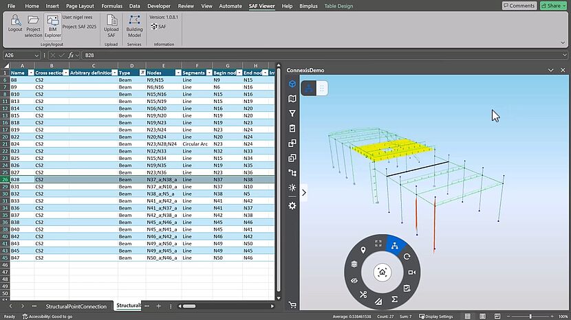 Darüber hinaus ermöglicht die Einbettung des BIMPLUS-Viewers in die Excel-basierte SAF-Umgebung eine interaktive Navigation: Wenn ein Objekt in der Datei ausgewählt wird, wird es im Modell hervorgehoben. Diese einzigartige Integration beschleunigt Überprüfungen, vereinfacht die Fehlererkennung und bietet Ingenieuren, die mit SAF-Daten arbeiten, leistungsstarke Unterstützung.