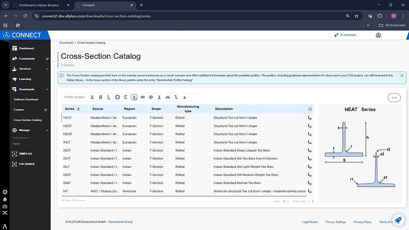 Greifen Sie auf einen umfassenden Querschnittskatalog für Baustahl zu, der jetzt in der Cloud verfügbar ist und von Teams und Partnern sofort genutzt werden kann. Da die neuesten Profile und Spezifikationen in einer einzigen Quelle gepflegt werden, profitieren alle von genauen und aktuellen Daten. Die intuitive Benutzeroberfläche erleichtert die Visualisierung von Querschnittseigenschaften und ermöglicht so schnellere technische Entscheidungen und eine reibungslose Zusammenarbeit zwischen den Projekten.