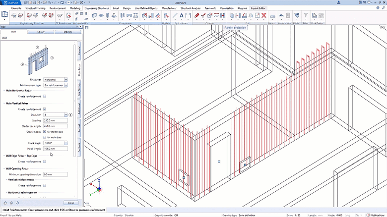 Durch die Automatisierung der Bewehrungsdetails können Anwender Zeit sparen, Arbeitsabläufe beschleunigen und mit größerer Zuverlässigkeit arbeiten. ALLPLAN 2026 verbessert den automatisierten Arbeitsablauf für die Bewehrung von Wänden weiter und bietet eine optimierte Automatisierung sowie eine schnellere Detaillierung. Die Priorität der horizontalen oder vertikalen Bewehrung kann mit einem einzigen Klick festgelegt werden, und jeder Bewehrungstyp kann nach Bedarf ein- oder ausgeschaltet werden. Dies macht die Automatisierung praktisch und intuitiv, sodass Anwender in vollem Umfang von der Geschwindigkeit, Zuverlässigkeit und Sicherheit profitieren können, die ALLPLAN bietet.