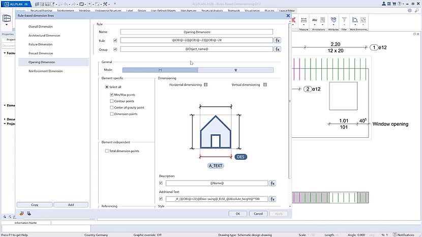 Sind Sie es leid, Stunden mit der manuellen Bemassung jeder Ansicht zu verschwenden? ALLPLAN 2026 automatisiert jetzt die Bemassungen entsprechend den individuellen Wünschen des Nutzers und den jeweils benötigten Informationen im jeweiligen Planabschnitt. Dadurch werden die Bemaßungen genau dort gesetzt, wo sie erforderlich sind, was die Effizienz und Genauigkeit bei der Dokumentation erheblich verbessert. Durch die automatisierte Erstellung und das optimierte Update-Verhalten können Fehler minimiert und mögliche Unaufmerksamkeiten ausgeschlossen werden. Gleichzeitig lässt sich der Vermassungsprozess erheblich beschleunigen, was zu einer effizienteren und zuverlässigeren Dokumentation führt.