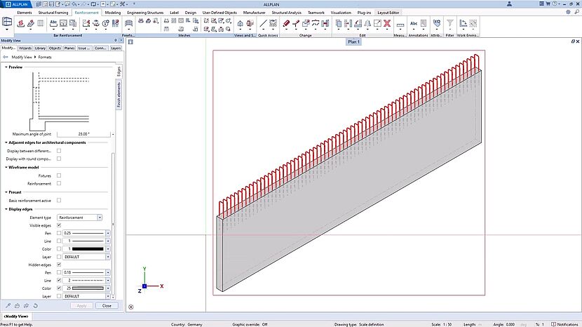 Dadurch lassen sich Ansichten automatisch nur mit dem herausstehenden Bewehrungseisen erzeugen oder bei Bedarf der verdeckte Teil der Bewehrung farblich unterschiedlich oder gestrichelt darstellen. Diese Verbesserung erhöht maßgeblich die Darstellungsqualität von Bewehrungsplänen und unterstützt eine präzisere und effizientere Produktion der Bauteile.