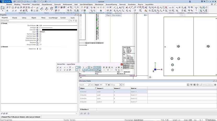 Mit der neuen Version 2026 ist es jetzt möglich, in Elementdecken vollautomatisch Füllkörper zu platzieren, um Gewicht zu sparen. Durch die Reduktion des Betonvolumens wird zudem ein erheblicher Anteil an CO2 eingespart, was zu einer nachhaltigeren Produktion von Elementdecken beiträgt. Die erfassten Daten lassen sich außerdem an alle kaufmännischen Systeme übergeben, und Leitsysteme können diese Einbauteile vollautomatisch mit Robotern platzieren. Dank dieser Automatisierung in der Planung werden erhebliche Performance-Gewinne erzielt, die den gesamten Planungsprozess effizienter machen.